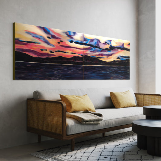 Reilly’s Tulips diptych. 30”x30”x1.5” oil sticks on imitation gold-leafed canvas.